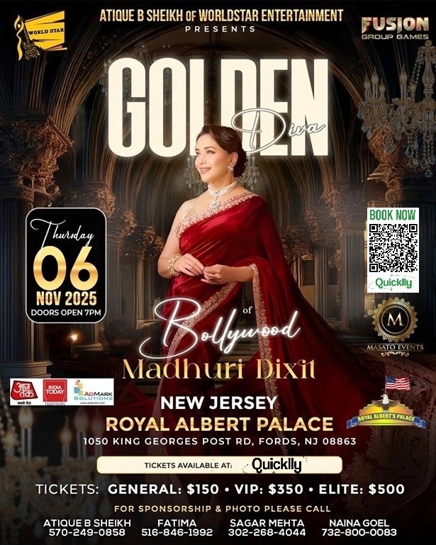 Welcome to An Evening with Madhuri Dixit - The Golden Diva in New Jersey! Join us at Royal Albert's Palace for a night filled with glamour, dance, and entertainment. Get ready to witness the iconic Bollywood star, Madhuri Dixit, in all her glory. This in-person event promises to be a memorable experience for all fans of the Golden Diva. Don't miss out on the chance to be a part of this exclusive evening!