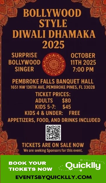 Get ready to experience the grandest Bollywood-style Diwali celebration in Florida! Join us for Diwali Dhamaka 2025 on Saturday, October 11, 2025, at 7:00 PM at the beautiful Pembroke Falls Banquet Hall, Pembroke Pines, FL.