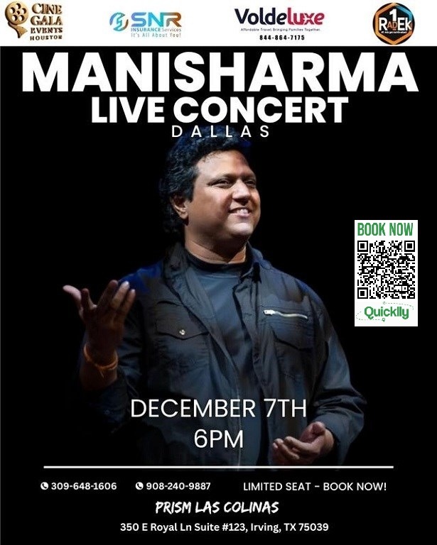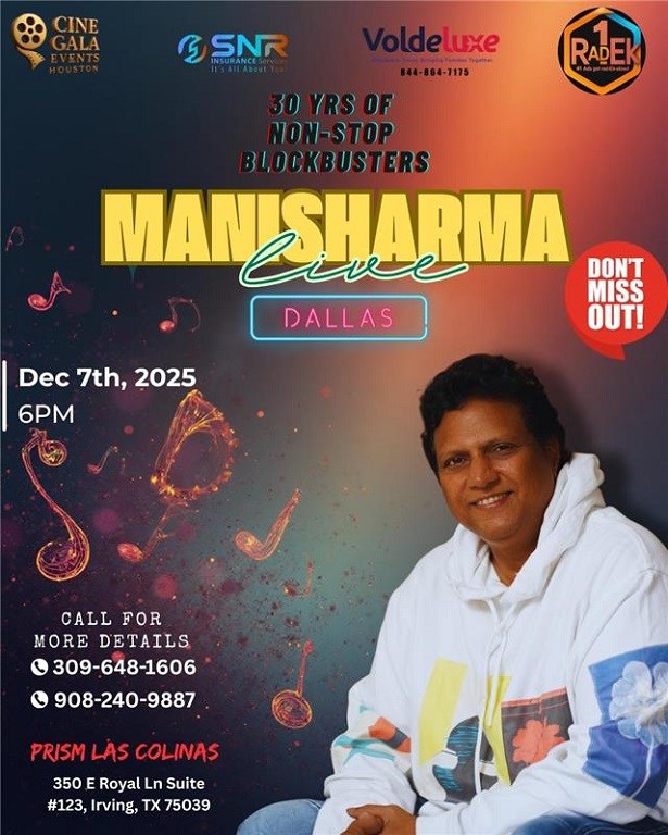 Don’t miss your chance to witness Mani Sharma’s musical mastery live in Dallas — a night of pure melody, rhythm, and unforgettable memories awaits!