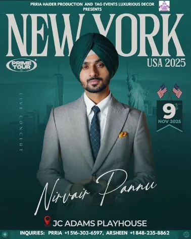 Get ready, New York! The sensational Punjabi singer Nirvair Pannu is all set to electrify the stage with his soul-stirring voice, powerful lyrics, and chart-topping hits. Known for his unique musical style that blends raw emotions with youthful energy, Nirvair has captured the hearts of audiences worldwide, becoming one of the most loved and admired names in Punjabi music.