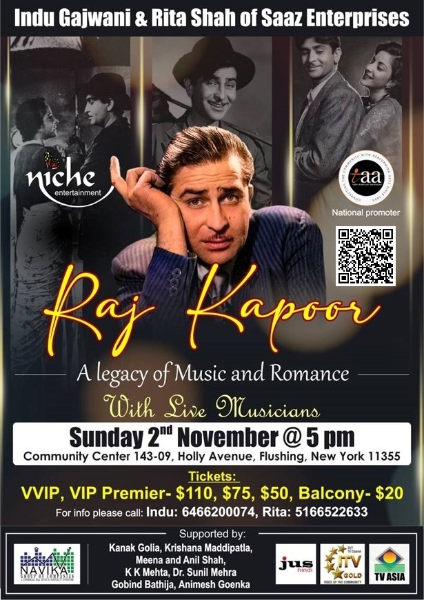 Presented by Indu Gajwani & Rita Shah of Saaz Enterprises in association with Niche Entertainment, this one-of-a-kind Bollywood musical tribute in New York features live musicians performing Raj Kapoor’s greatest hits. Relive the charm of his unforgettable movies, soul-stirring songs, and timeless romance that made him a global icon.